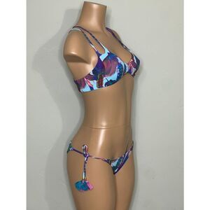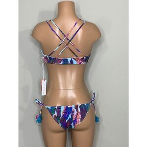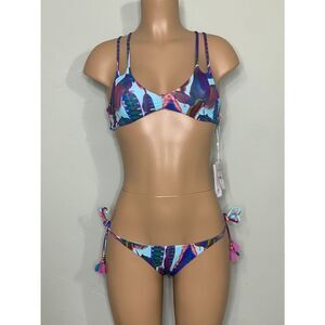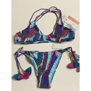 New. This Pilyq is a feather-inspired light blue and purple printed bikini set. Comfy pullover halter top and teeny (very cheeky) bottoms.