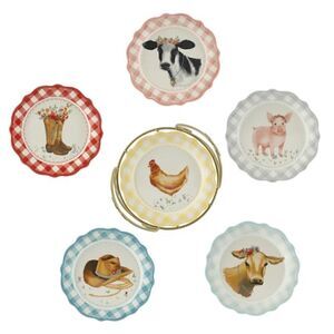 • Each plate has a scalloped edge with a gingham border and a country-chic design