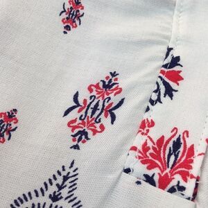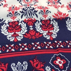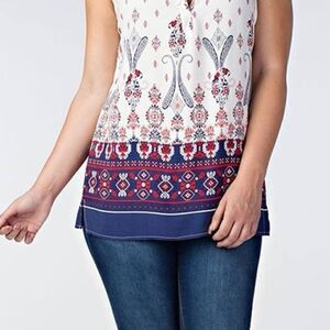 Plus size sleeveless paisley pattern tunic top with border print near the bottom of the hemline.