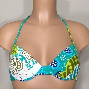 Beautiful vibrant colors olive, teal, blue and white. Such a pretty top. Would look great with solid bottoms or shorts!