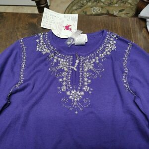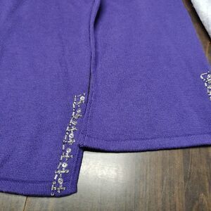 New quacker factory sweater size women's small. It is purple with beads and sparkly rhinestones and beads has zipper at neck. 18 inches across and 26 inches long has 3 inch slits on sleeves with sequins and beads sides on the bottom also have slits with sequins and beads