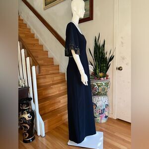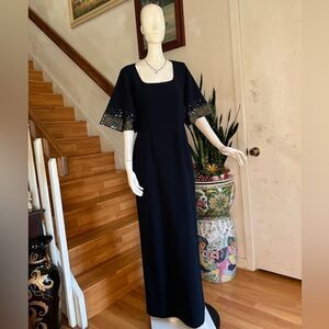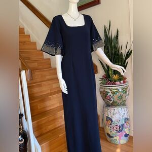 Sequined sleeves add a festive flourish to this elegantly tailored crepe maxi dress.