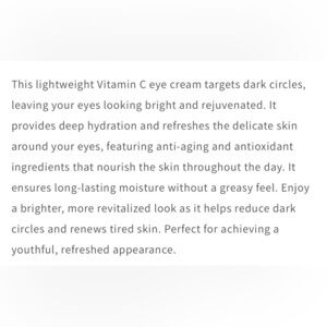 This lightweight Vitamin C eye cream targets dark circles, leaving your eyes looking bright and rejuvenated. It provides deep hydration and refreshes the delicate skin around your eyes, featuring anti-aging and antioxidant ingredients that nourish the skin throughout the day. It ensures long-lasting moisture without a greasy feel. Enjoy a brighter, more revitalized look as it helps reduce dark circles and renews tired skin. Perfect for achieving a youthful, refreshed appearance.