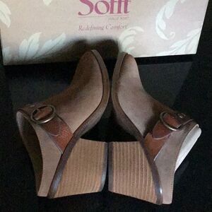 Antique-finished hardware adds a western appeal to this clog-style mule set atop a block heel for a comfortable lift.