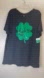 Black, 80% recycled polyester, 20% cotton, Super soft, Lucky shamrock front of shirt, plain black on back of shirt.