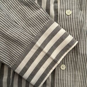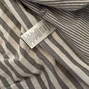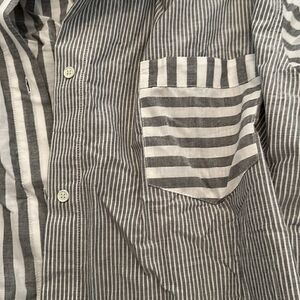 Brand new never worn has so many uses can be worn as a button down with jeans as a cover-up over a bathing suit or as address for going out really great multidimensional, gray, and white stripe. Has one small slit at the bottom came like that from the factory can easily be stitched up. great summer or vacation piece.