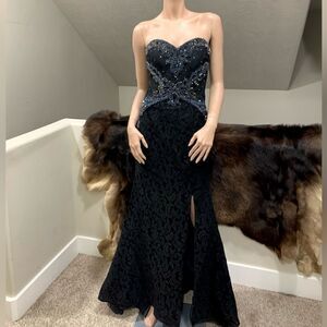 Highest quality. Gorgeous, sexy and glamorous evening gown, black floral lace with delicate hand sewn beads and shiny rhinestones. Strapless, front split design. Suitable for all kinds of formal gatherings and cocktail parties.