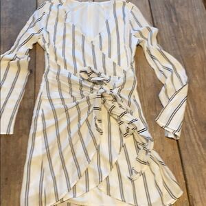 Dress features: contrast vertical stripes, mock wrap, v-neck, layered scallop hemline, hidden back zipper closure, bust darts, mini length, casual, chic, office wear, vintage, chic, lined, some stretch.
