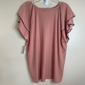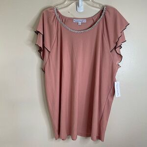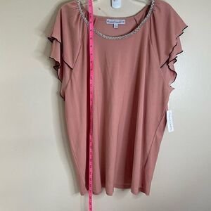 New! Sweet Violet|Super soft| Flowy| very flattering| Rhinestone neckline| 96% polyester 4% spandex| Has stretch| Salmon color with touches of black on shoulders and silver rhinestone neckline