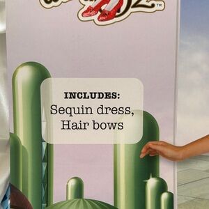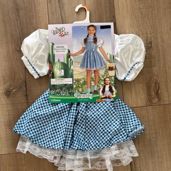 Adorable Dorothy costume with checkered pattern. Includes puffed sleeves and lace details. Ideal for dress-up fun.