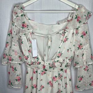 Topshop Bardot White Pink Floral Swiss Clip Dot Cold Shoulder Ruffle Long Sleeve Playsuit Romper. New with tags. Size 6.