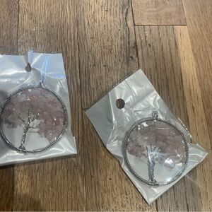 New tree of life pendant about 2 inches in diameter. Silver tree design with a rose quartz stone for the leaves.