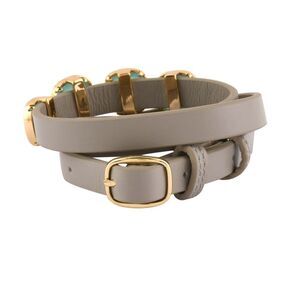 This pretty bracelet can be dressed up or down. Four faceted genuine Peru chalcedony gemstones slide on a 22” long genuine taupe leather wrap style bracelet. The gemstone settings and buckle are done in a heavy gold plate.