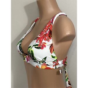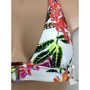 New. Trina Turk floral bikini top. Beautiful floral pattern in colors of pink, purple, orange, green, white, and yellow. High-quality fabric. Soft removable pads. Straps crisscross in the back and tie for easy adjustment. Decorative tortoiseshell and lavender buckle on the front.
