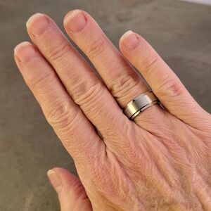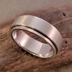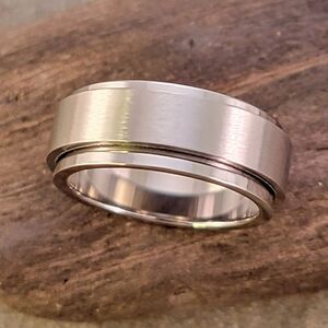 Brand new unisex silver stainless steel spinner ring band. The features a brushed texture on spinner and shiny finish on the exterior of the ring.