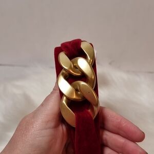 Materials gorgeous Burgundy wine velvet, goldtone chain link, lined in black suede