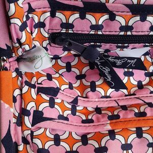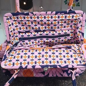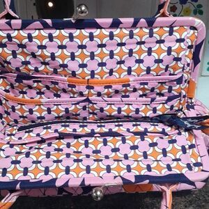 This cheerful printed purse has Spring written all over. There is a compartment for everything including an outside one that will hold your phone at the ready. The bag is new but the tag is gone. It measures about 15" at the bottom and about 12" long.