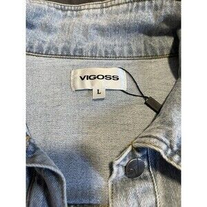 It is a 100% cotton jacket by the Vigoss Denim company and has white fringes front and back, giving it a country western cowgirl vibe.