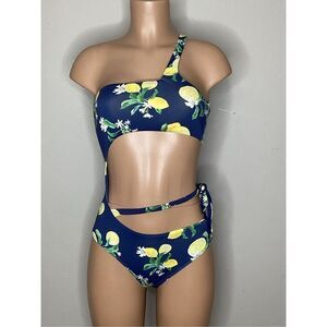NEW. WET L.A. designer "Paloma" monokini swimsuit with a navy background and yellow lemon print. The material is imported from Italy and designed in L.A. The monokini has a one-shoulder design with a cutout at the waist and ties on the side. WET Swimwear is your ultimate destination for luxury swimsuits. They are a Los Angeles-based brand offering luxury, classic styles perfect for any beach or poolside.