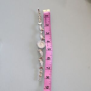 Cute little dolphin jewelry set. Never used. Watch needs a battery, and the box is deteriorating from being stored in hot garage, but jewelry looks brand new. Great set for a pre-teen/teen! Stainless steel. B3.1211