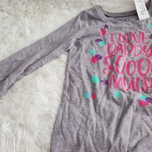 This bundle include 2 NWT long sleeve shirts and 1 NWT pair of jeans. One shirt is gray and says "I love daddy so much" and the second one is a blue purple mix saying "Sassy runs in the family." The pair of jeans are 5T Super Skinny Jeans with an adjustable waist band (a Mother's dream).
