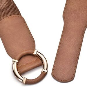 Material: 60% elastic for the band 20% pu leather for the belt on the front and 20% alloy buckle with leather wrapped, belt wide 2.4 inch(6CM), gold circle buckle 2.9 inch diameter, cute and elegant