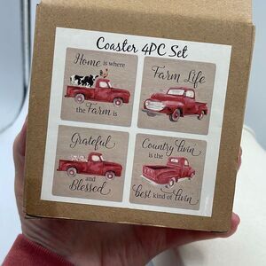 New Wooden Farm themed coasters. New in box, never used. No flaws. Wooden with cork bottoms.