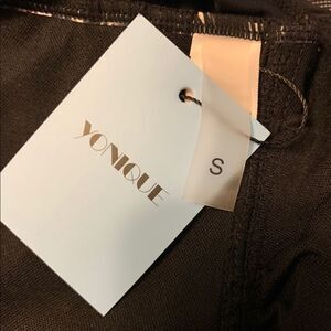 Yonique black ruffled tankini top with adjustable straps and removable bra padding. Bust 32”. Brand new with tags attached.