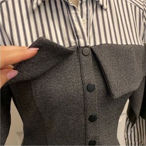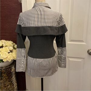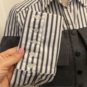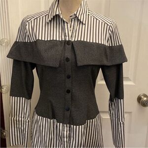 Stylish button-down with bold black and white stripes. Features unique design with contrasting panels. Perfect for a modern look.