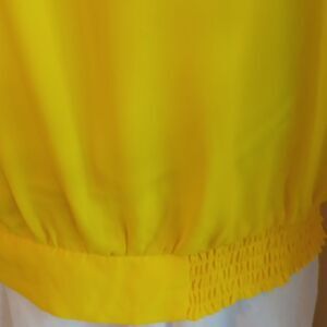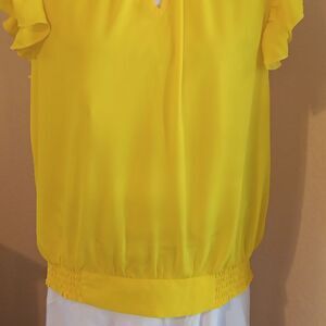 Elevate your style with this vibrant yellow blouse from New York & Company, featuring a chic ruffled mandarin collar and delicate ruffled cap sleeves. Size L measures 44 at chest, 38-48 at bottom hem. 25 l9ng from shoulder to hem. The lightweight fabric and elastic shirred waistband create a flattering blouson effect, perfect for a dressy occasion.