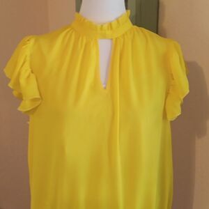 New York & Company Yellow Ruffled Mandarin Collar Blouse. Colorful. Bright.