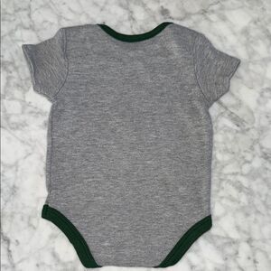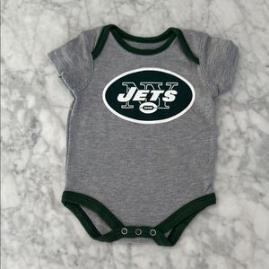 Set of three New York Jets baby onesies. Features green and gray colors with team logo.