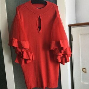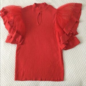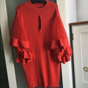 7th Avenue red Large top, stretch knit, ribbed ruffle sheer ribbon sleeves, keyhole detail. 24” long, 34” bust