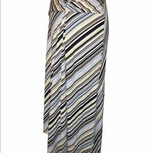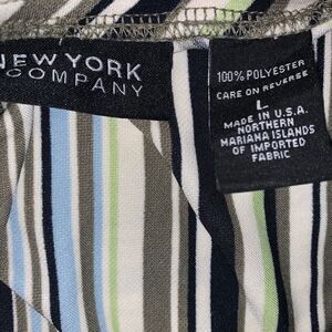 New York & Co Striped Asymmetrical Striped Skirt. Olive green multi asymmetrical striped skirt. Elastic waistband with side ruching. Stretch material. 100% polyester. Size: large. Preowned in good condition.
