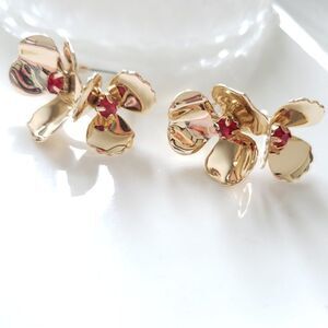 These Stunning Zara Statement Ruby Red Glass Stone Floral Post Back Earrings. Must-Have Elegant & Beautiful Earrings. Features Two Ruby Glass Stones Setting In Gold Floral Post Back Earrings