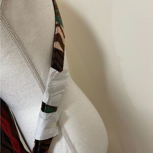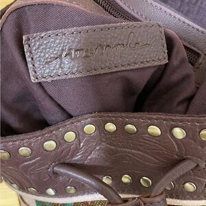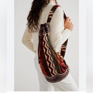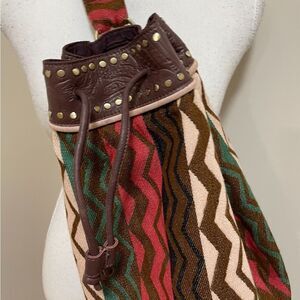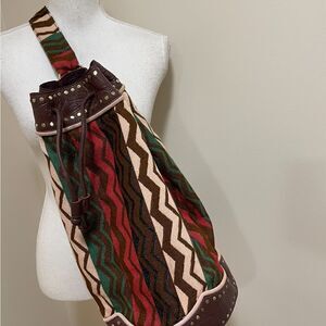 Features: Sling style, cotton tapestry fabrication, round structured leather bottom, embossed detailing, leather trim, drawstring closure, adjustable shoulder strap, interior zipper compartment, chevron print, stud details