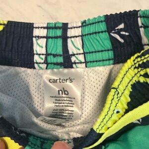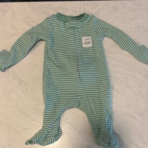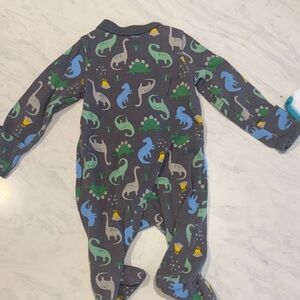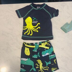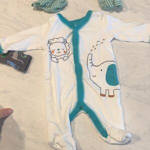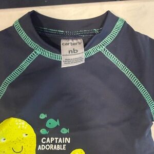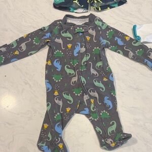 Navy short-sleeve swim shirt and coordinating navy and teal patterned swim trunks. Three sleep and plays, 2 zip closures by Carter’s Simple Joys and one button up by Koala baby. The grey has some fading form washing.