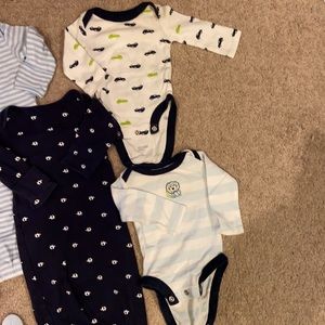 Bundle of gently worn newborn boy clothes, all some wear but good condition. 2 gowns, 2 snap clothes long sleeve onesies, 2 hats.