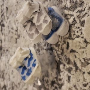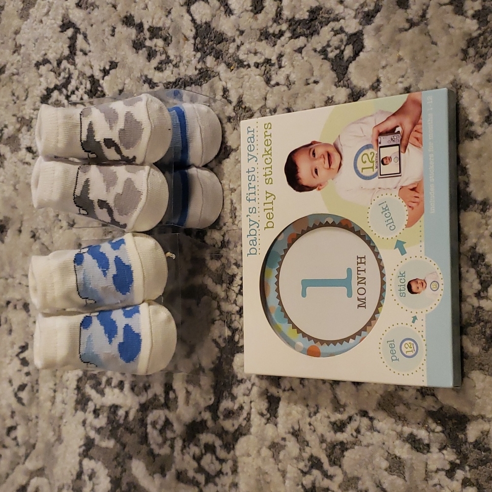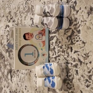 Newborn sock looking shoes and Baby's 1st year belly stickers. Used only 1 pair of the 4 pairs of socks.