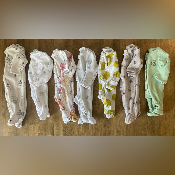 7 newborn onesies - FANTASTIC used condition. All from Target. 6 are Carters & the green outfit with smiley face is Cat & Jack.
