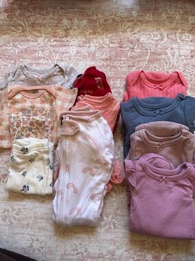 Either new without tags or only worn a couple times. Includes 3 footies, 2 pants, 2 short sleeve onesies and 4 long sleeve onesies. Brands include caters, cloud island, and gerber. Light pink footies has light pilling noted