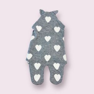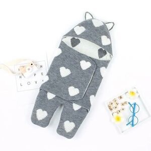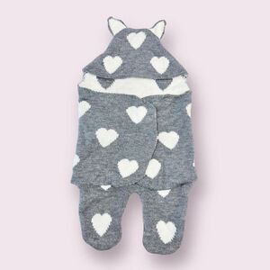 Knitted sleeping bag with footies and little ears. The heart patterned sleeping bag wraps around your child for comfort.