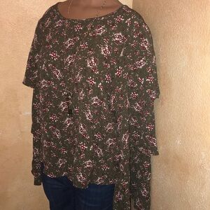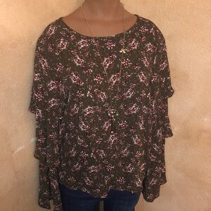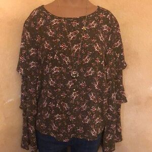 Excellent condition. Size medium. Floral ruffle sleeve blouse by Newbury Kustom. Betsey Johnson key necklace not included.