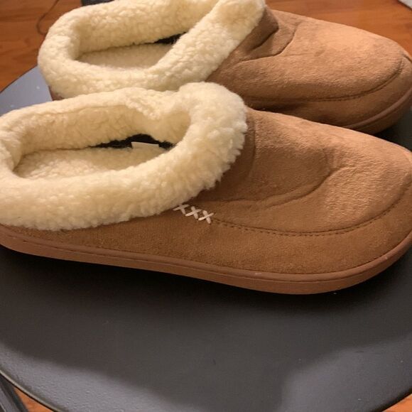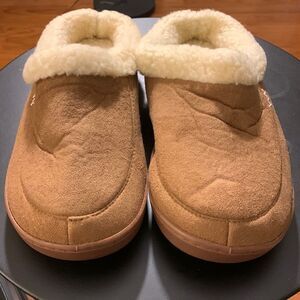 Size 6-7 faux sheepskin slippers in tan & cream. NWOT