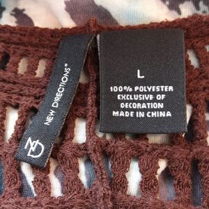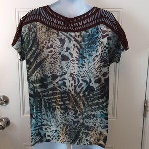 New directions brown crochet neckline and shoulder printed top with beading.