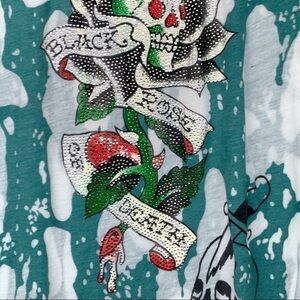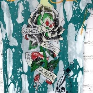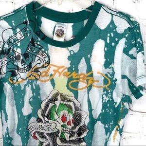 Brand new. With tags. Authentic Ed Hardy Burnout sheer Black Rose Of Death Skull T-Shirt. Rhinestones studded tattoo in front. Multiple tattoos printed in front. Green & white stretch fabric. Logos in front and back. Cap short Sleeves.