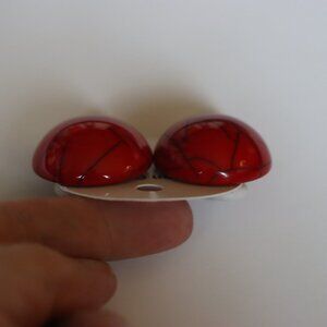 Newer Marion Godart Clip On Earrings. Red with black stripes. Resin. Dome shaped. 1" across earring. Candy apple red. Earrings are on original card. Mint like new condition. Clips are tight and work perfectly.