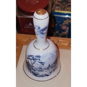 High quality Newhall fine English Bone China collectors bell in a delicate blue and white Chinese-inspired landscape scene with pagodas, trees, water features, bridges all rendered in shades of blue on a white background.