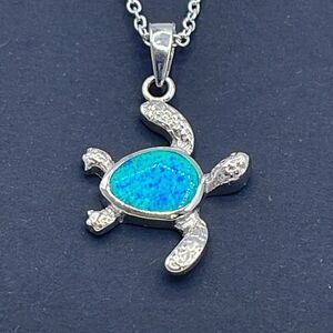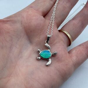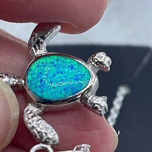 New in package silver opal turtle 18” necklace . Each piece stamped 925. I’m sure opal is manmade but it’s stunning. Bright ocean blue. . No flaws.