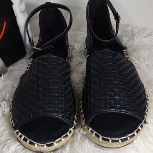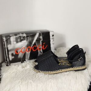 These new in original box Ccocci Eden black faux leather sandals are a size 5.5. They have an ankle strap with elastic at buckle for that perfect fit. Braided rope around sole. All offers welcome.